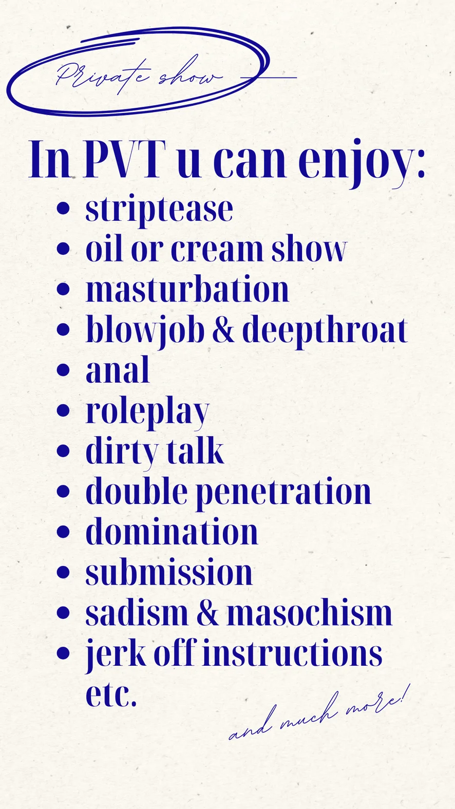 Ngoài trời, Đánh giá Dương vật, Lộ hàng, Yoga, Cao gót, Cách nói Gợi Dục, Hướng dẫn Tự sướng, Hút thuốc, Twerk, Da, Latex, Củ dildo hay Máy rung, Xuất Trong, Bịt miệng, Đóng vai, Diễn với dầu, Ở trần, Xóc bằng chân, Múa Thoát Y, Thổi kèn, Nylon, Đồ chơi núm vú, Vén váy, Thủ dâm, Quan hệ kiểu Doggy, Làm nhục, Đánh đòn, Nhảy Khiêu Dâm, Mê bàn chân, Mông đến Miệng, Đẩy ngực, Cực khoái, Bú tràn họng, Móc cua, Kiểu Cưỡi Ngựa, Đồ chơi Hậu Môn, Thâm nhập kép, Hậu môn, Nắm đấm tay